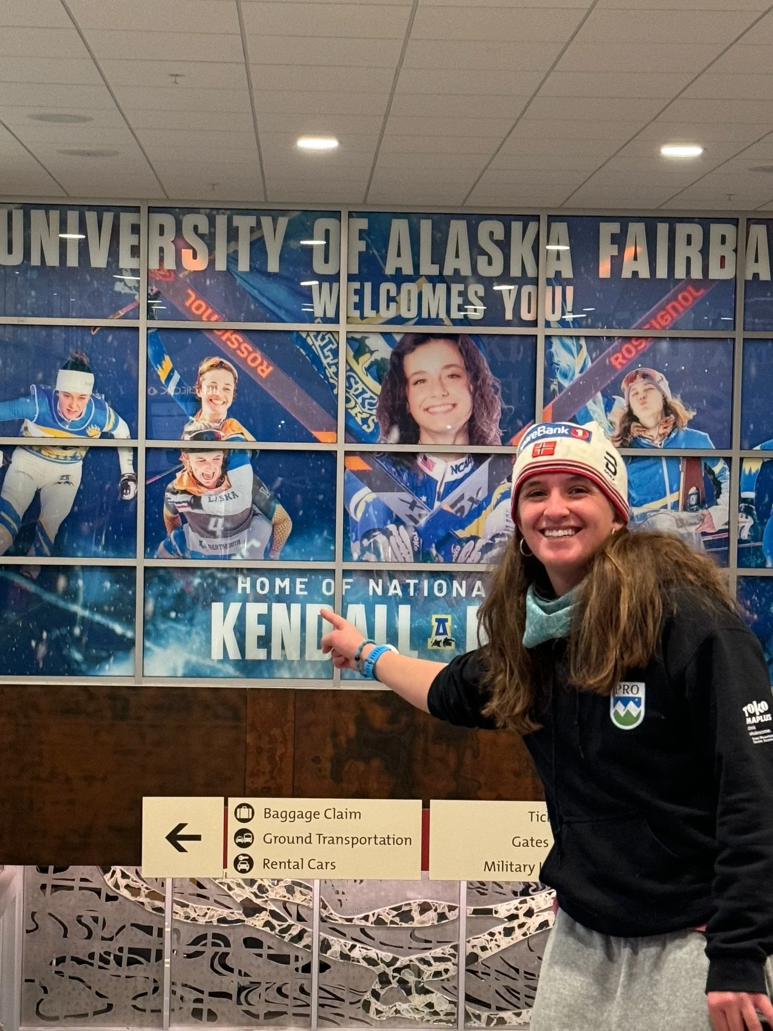 This is Annie McColgan checking in from Anchorage, Alaska. The sun doesn’t come out for much time these days, but when it does, the mountains are beautiful. Skiing at the Kincaid trails at the base of the ocean is a pretty unique space indeed. We were supposed to be skiing in Fairbanks for our first weekend, but with cold temperatures, the race organizers quickly and smoothly moved the venue to Anchorage. While it was tough to initially get settled in Fairbanks to turn around and head to Anchorage, I’ve been super impressed with our whole team’s adaptability and ability to handle change. We were able to get our flights changed and our place to stay early in Anchorage, and we made the hop over to Anchorage. I had spent Thanksgiving in Anchorage with my buddy Novie McCabe, and so I really had a flip flop, flying to Fairbanks from Anchorage on Monday, and back on Thursday. All things considered, everything went smoothly, and we made it to some more pleasant and temperate skiing. However, we were still pretty bummed to leave Fairbanks, as the courses there were pretty awesome. Not to mention the massive blow-up of me carrying NCAA Champion Kendall Kramer at the Fairbanks airport, welcoming travelers to Fairbanks. The guys at TSA thought that was pretty funny.